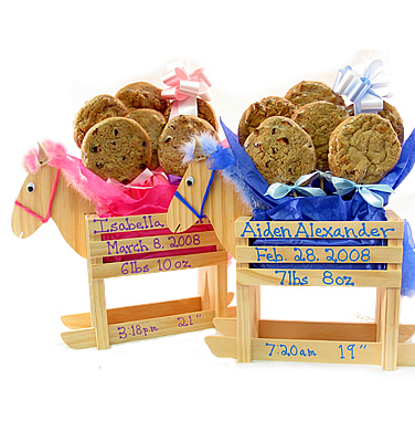 Standing an impressive 16 inches high, this charming rocking horse is customized with the baby’s name, birth weight, and time of arrival—creating a timeless nursery keepsake parents will cherish forever. Of course, the celebration is made even sweeter with an arrangement of our signature 1/4 lb gourmet cookies.